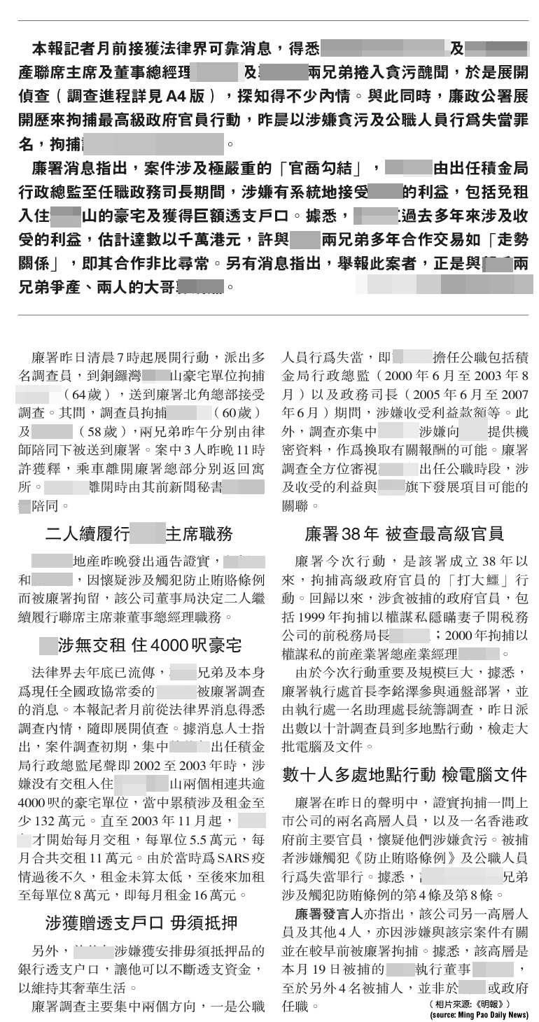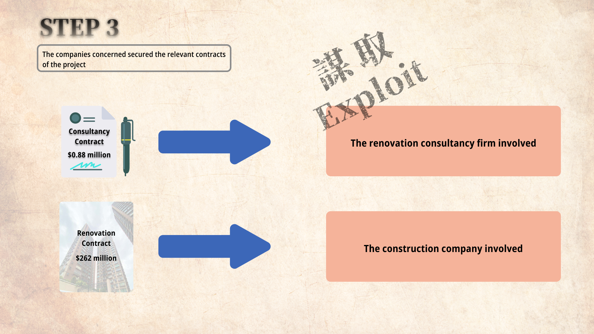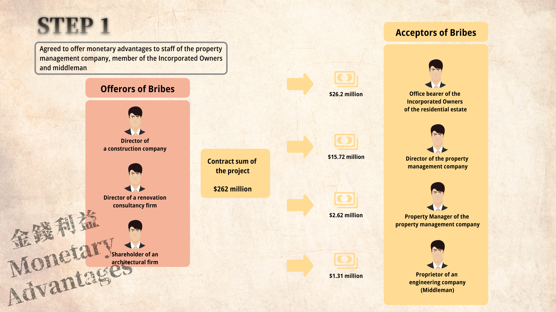 As Hong Kong’s buildings are ageing, the public has a strong demand for building maintenance works. Amid this trend, bribery was detected by the ICAC. In a case regarding a $262million-worth renovation contract, the total amount of bribes amounted to 17% of the contract sum. A member of the corrupt syndicate was subsequently sentenced to imprisonment and restitution of the bribes to the Incorporated Owners of the estate.