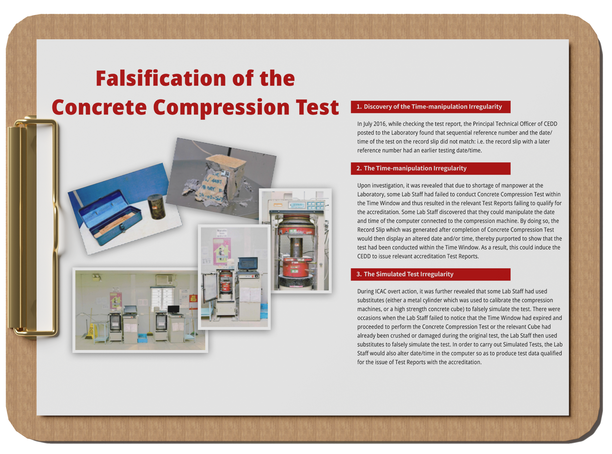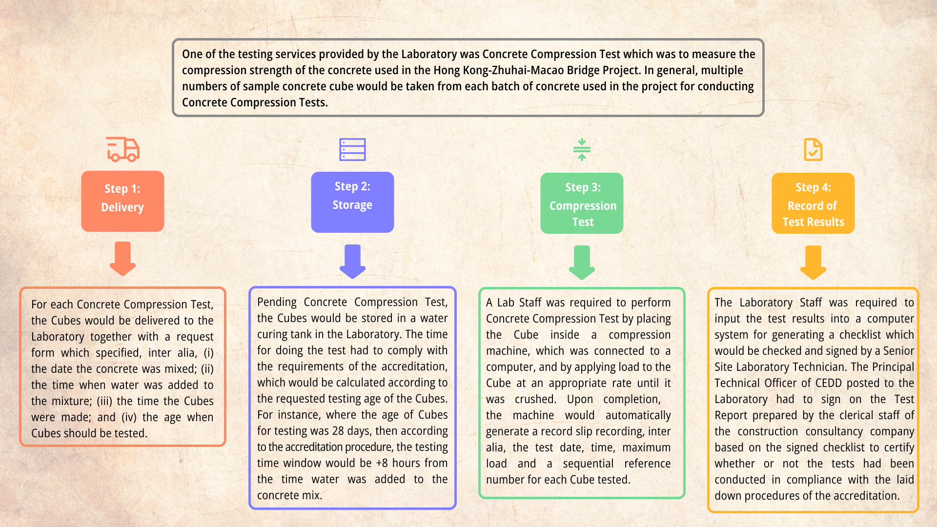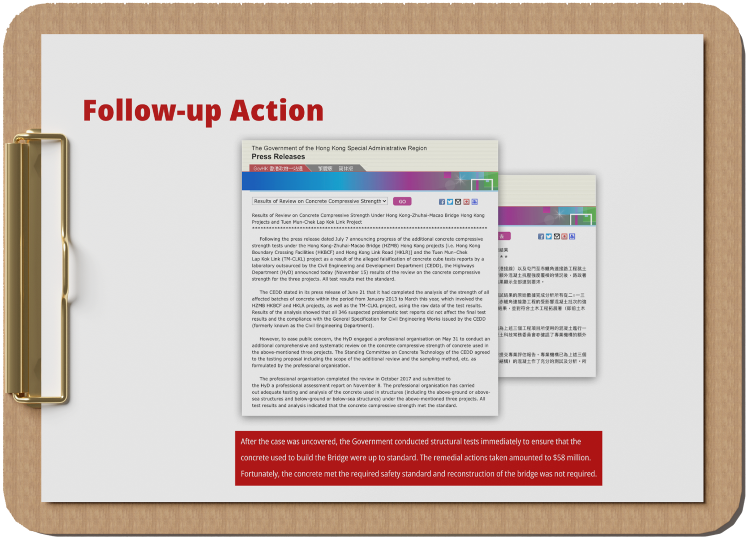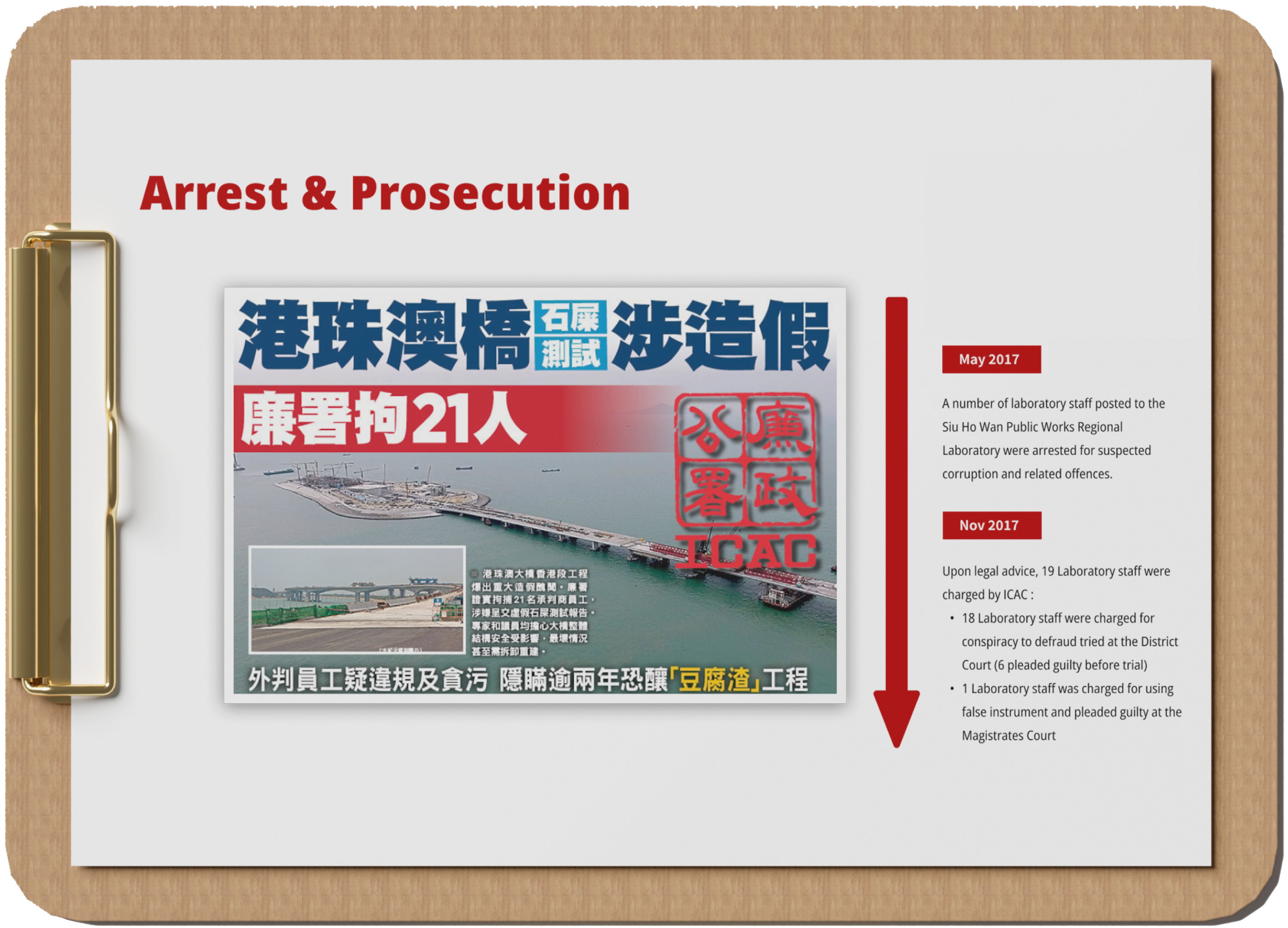 During the construction of the Bridge, various laboratory staff of the consultancy were found to have altered the testing time in order to falsely show that the test comply with the testing requirements.