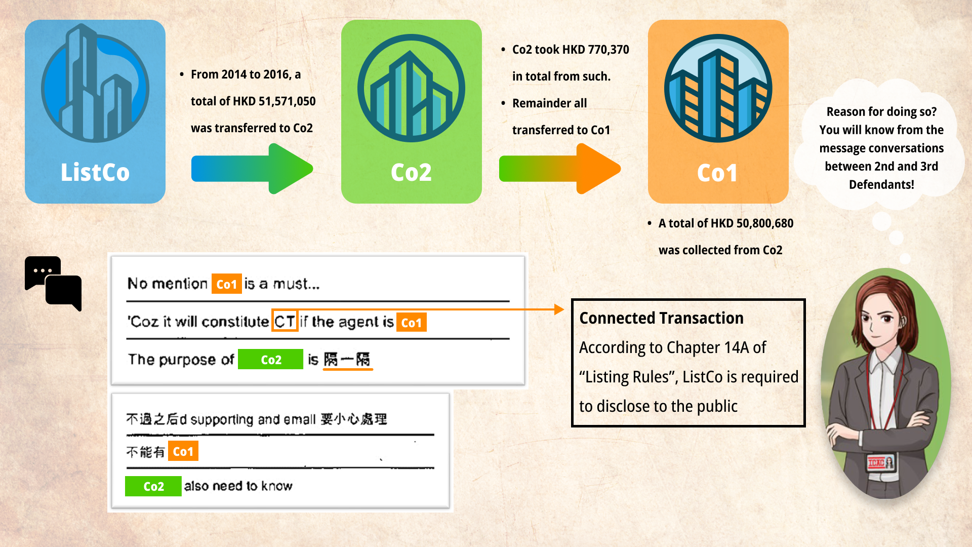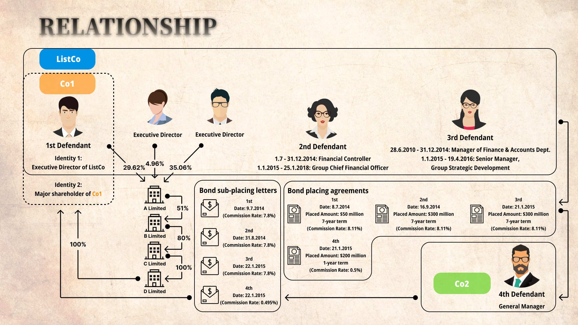 An Executive Director (ED) of a listed company (ListCo) held substantial shares of a company (Co1). Between 2014 and 2015, ListCo engaged another company (Co2) as placing agent of its four bond placements. The ED, two employees of ListCo and a General Manager of Co2 arranged to engage Co1 as the actual placing agent, but never disclosed such. The non-disclosure of the same deprived ListCo’s shareholders of right to vote against the sub-placements, and hindered Stock Exchange of Hong Kong’s enforcement of Listing Rules.