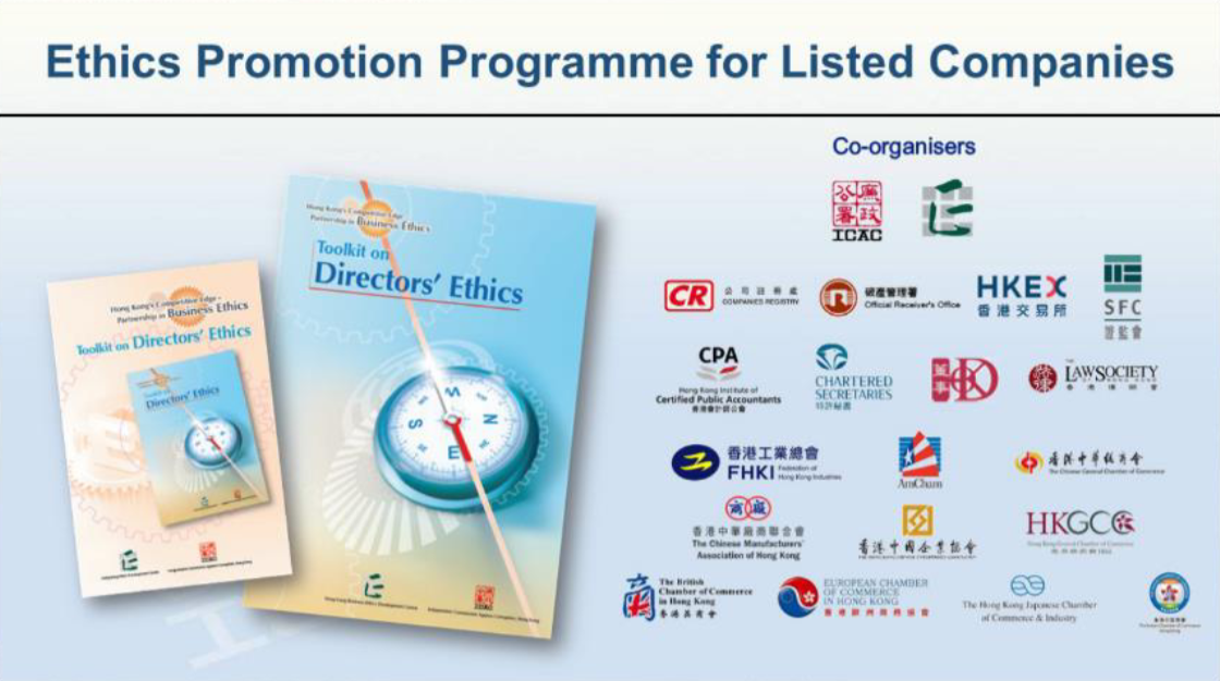 The Hong Kong Business Ethics Development Centre (HKBEDC) of the ICAC partnered with 18 co-organisers to launch the three-year Ethics Promotion Programme for Listed Companies in 2015. The Programme aims at enhancing the awareness of the top management and related professionals of the importance of practising ethical leadership and implementing good corporate governance.